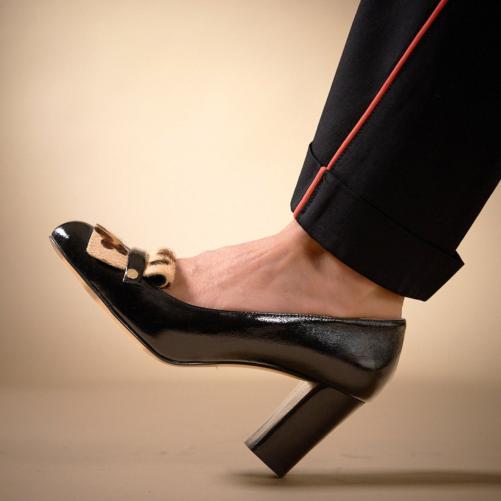Notre escarpin façon mocassin à talon en cuir vernis et détail léopard.