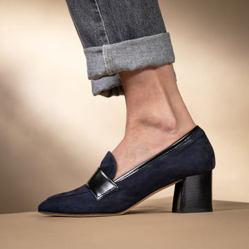 Une petite hauteur pour le nouveau mocassin Matteo, décliné en chevre velours bleu marine avec le détail de l'empiècement en veau noir.